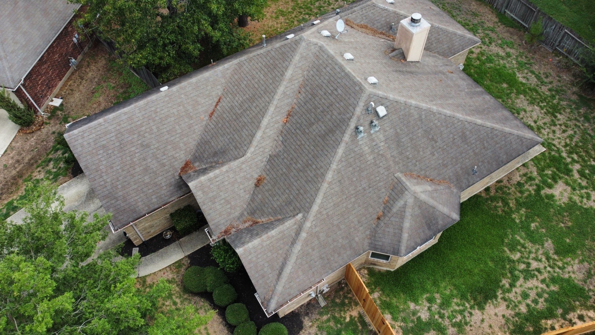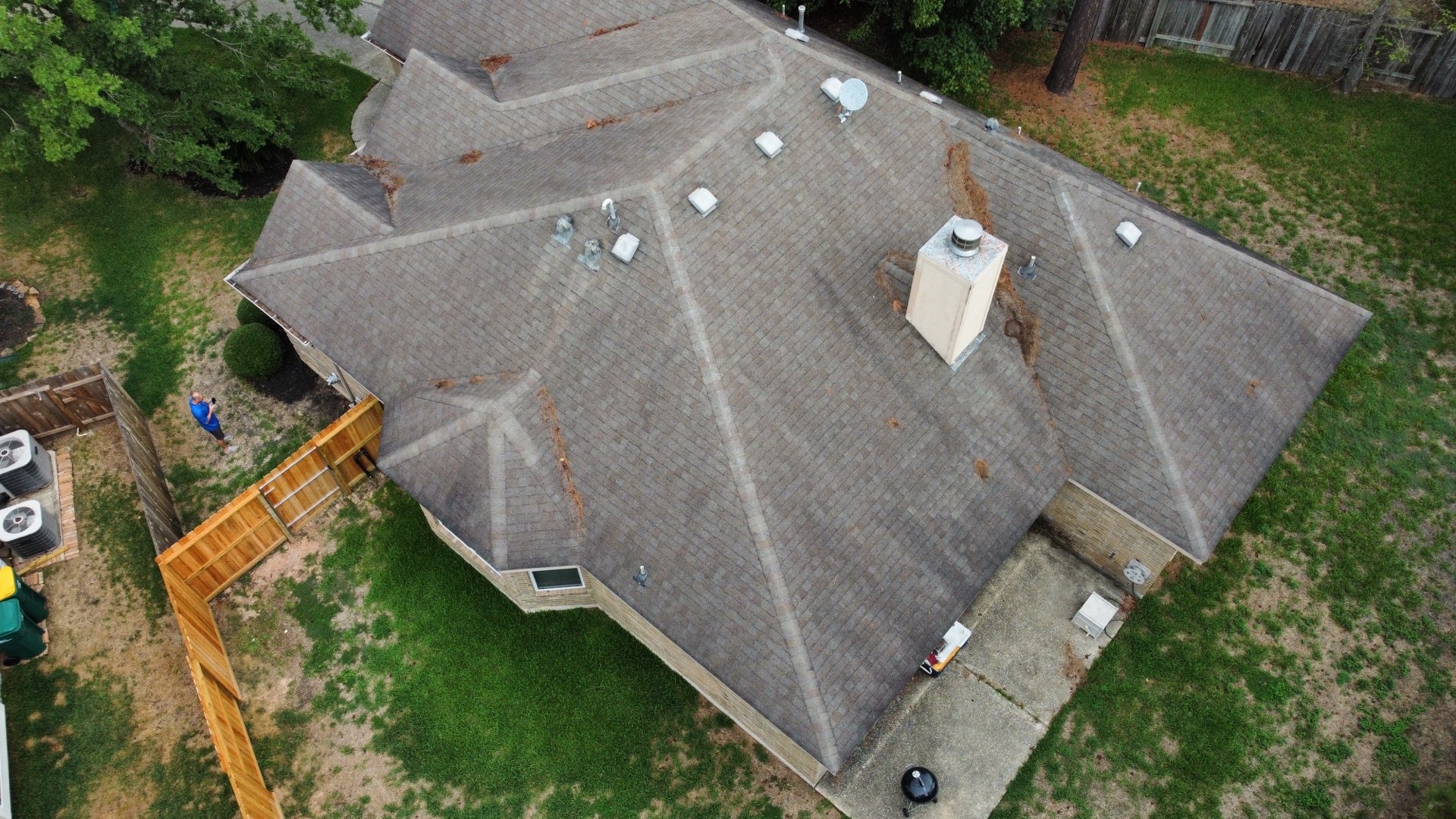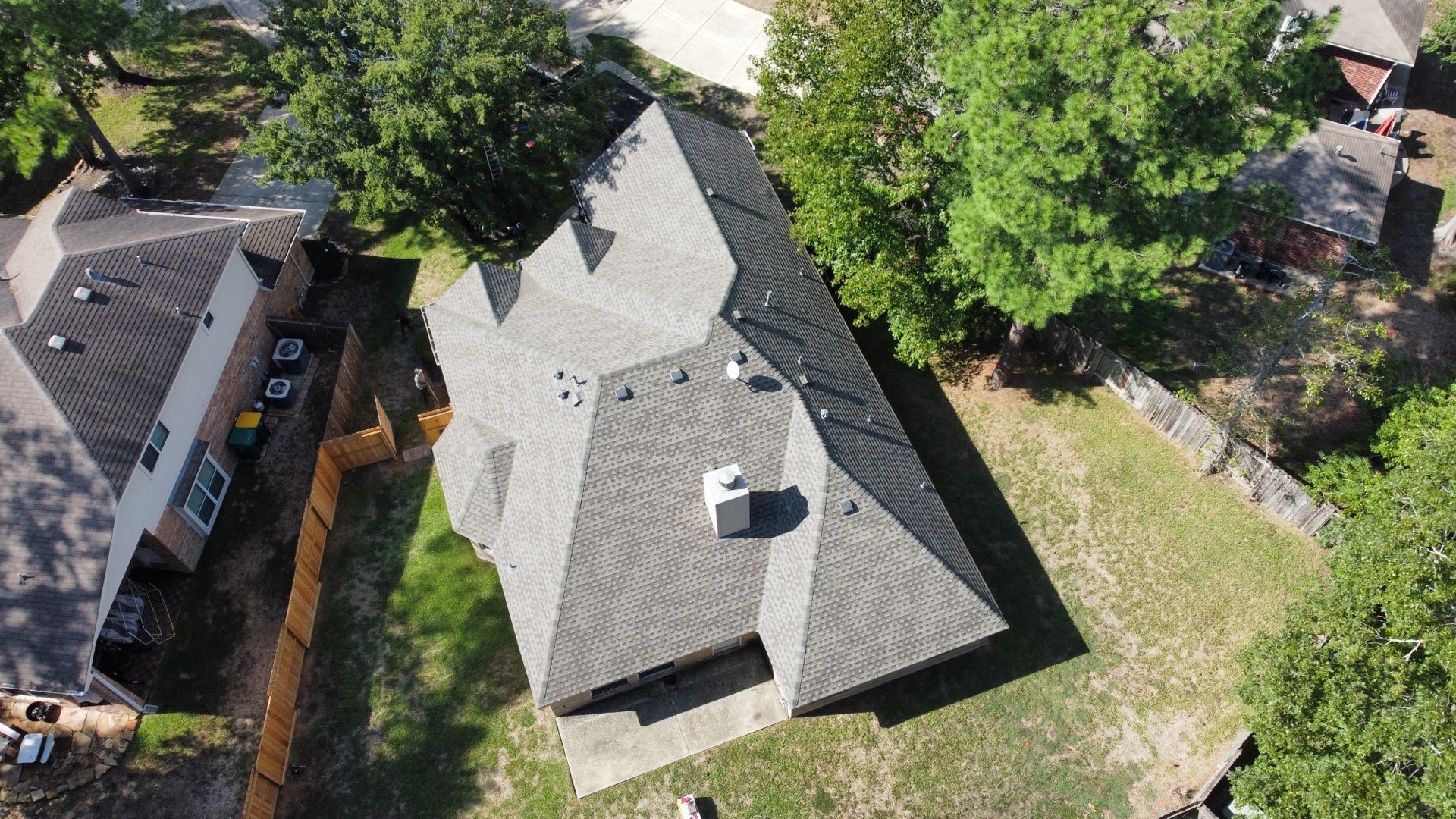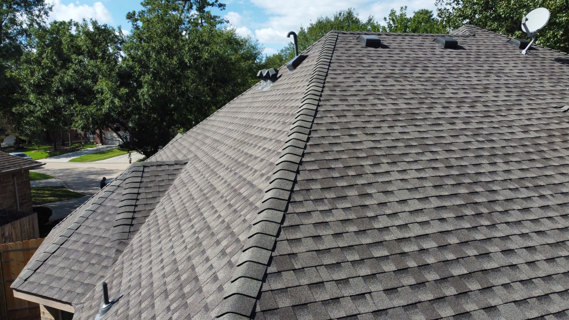 Roof replacement in The Woodlands, Texas with GAF Timberline HDZ in Weathered-wood and GAF Z-ridge hip and ridge shingles.